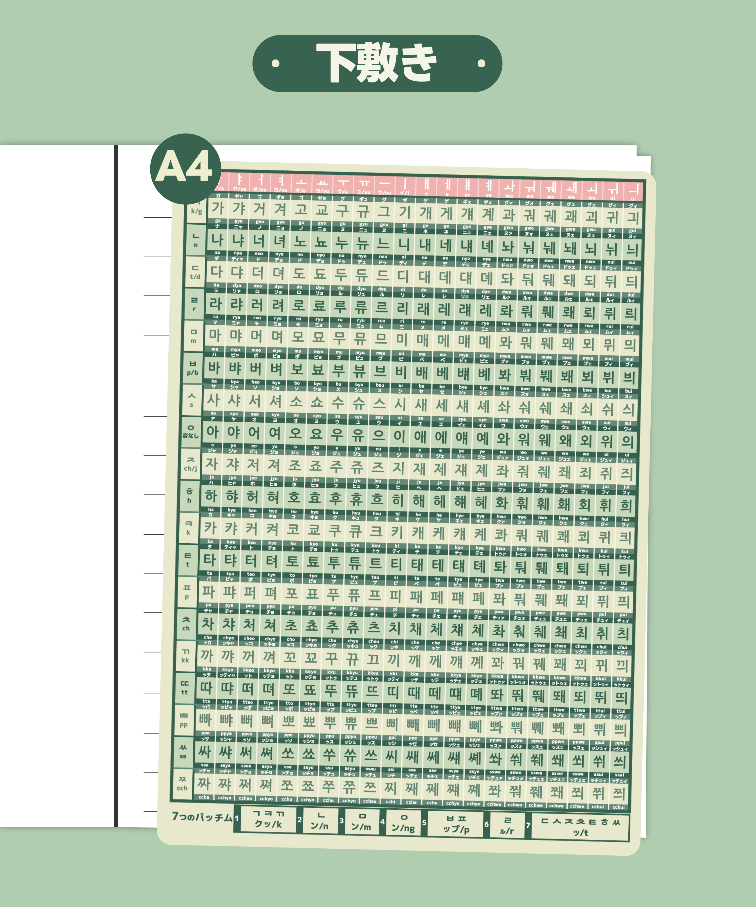 表面は日本語の50音からもハングルが読めて、なんと裏面は全てのハングル(母音・子音・激音・濃音・合成母音・パッチム)を1枚にまとめた、日本初のハングル表となっています。