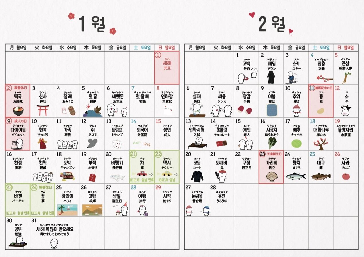 このカレンダーには、日本の休日はもちろんの事こと、韓国の休日やイベント日・雑学なども書かれたカレンダーになっています。